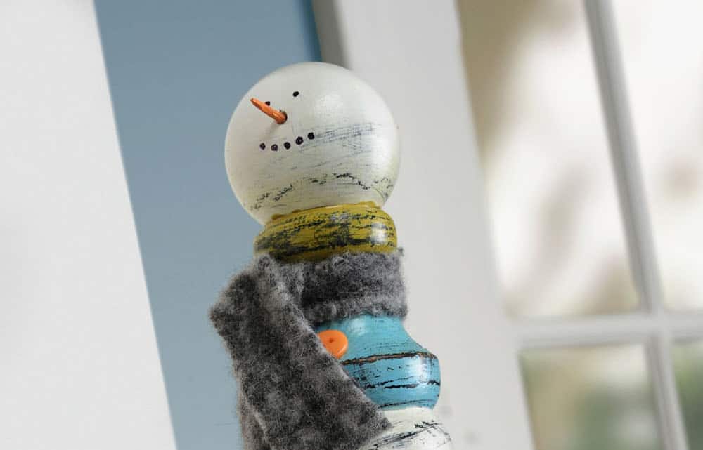 Grab a wood spindle from the hardware store or a construction site and turn it into this unique snowman craft. This snowman made from wood is perfect seasonal display piece!