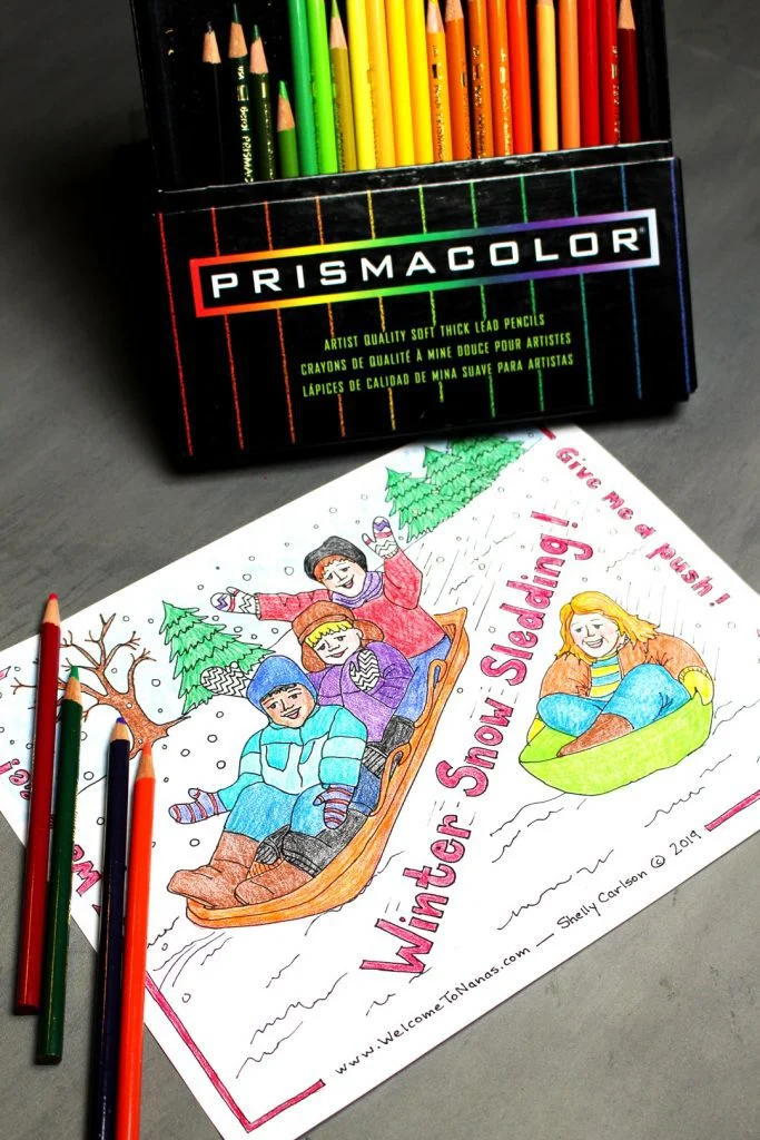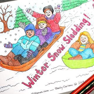 This Winter Sledding Snow Coloring Page is inspired by the joyful faces of my grandkids, as well as your kids! Print off some free copies of this coloring page, grab your colored pencils, markers, or crayons, and enjoy some winter fun.